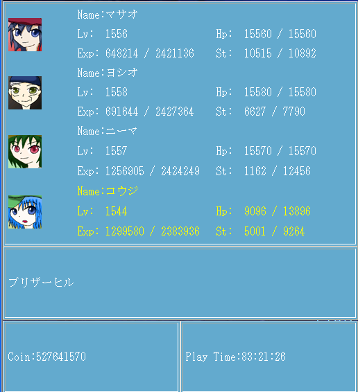 レベル225 変換2回90:120ぐらい 職業:統領だったはず Hp3500弱 Sp・Stそこそこ